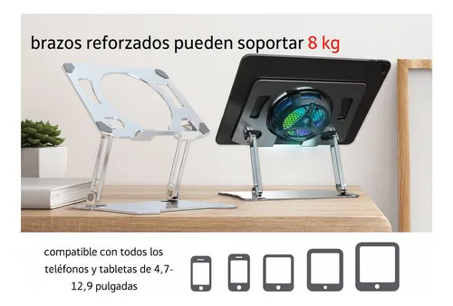 Este soporte para tabletas de gran tamaño es ajustable en altura y ángulo (15° a 180°), permitiendo un uso cómodo para personas de distintas estaturas incluso por periodos prolongados. Fabricado en aleación de aluminio con diseño hueco, favorece la disipación del calor y permite añadir radiadores para mayor eficiencia y seguridad. Es compatible con una amplia gama de dispositivos de 4.7 a 12.9 pulgadas, incluyendo iPads. Su estructura robusta, con base antideslizante y cuerpo de aluminio reforzado, garantiza estabilidad y protección. Además, es portátil, plegable y ligero (11.25 oz), ideal para trabajo, entretenimiento o viajes.